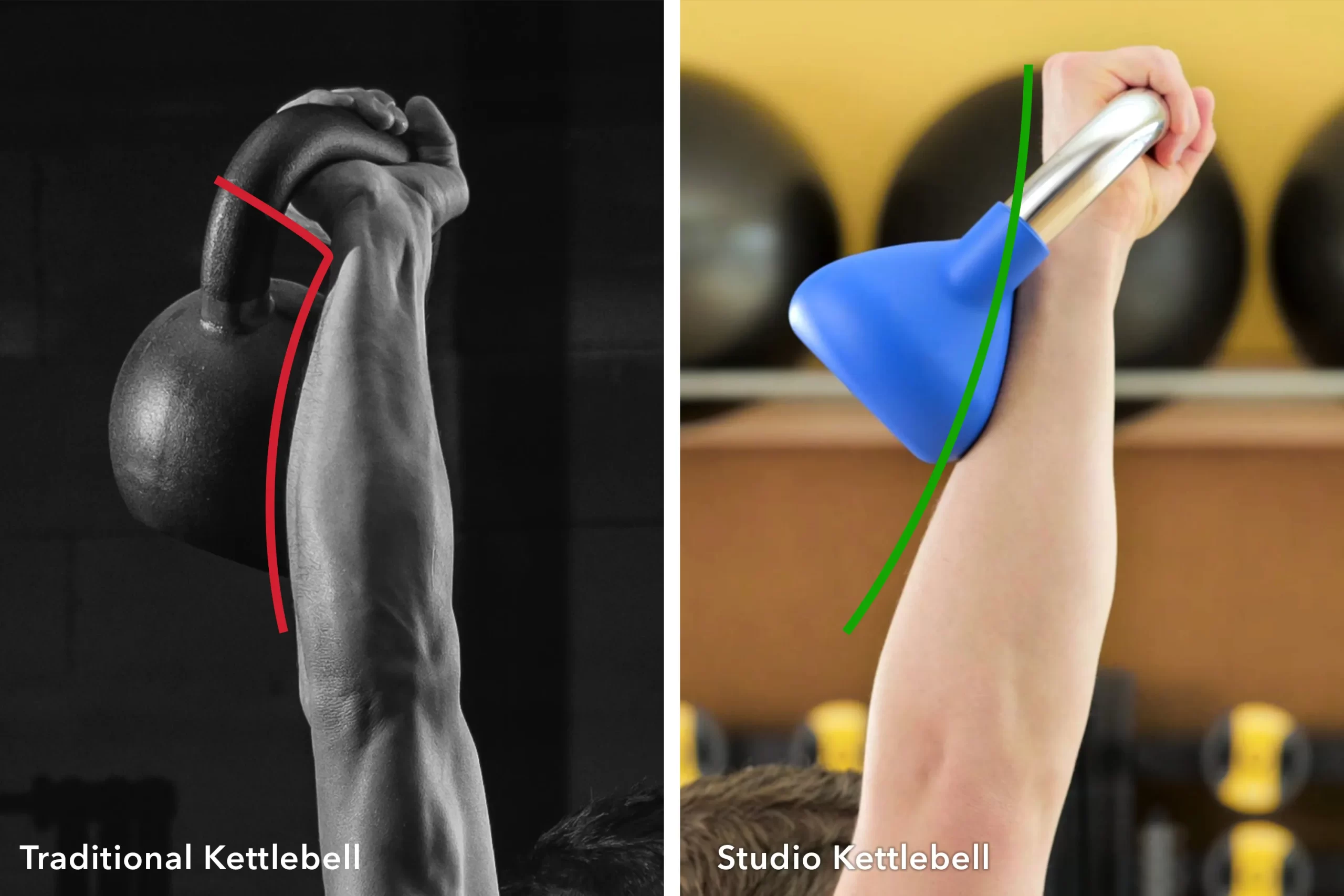 Life Fitness Studio Kettlebells were designed to illimate the painful pressure point of traditional kettlebells. The inverted curvature of the Studio Kettlebell helps distribute forearm pressure during overhead movements.